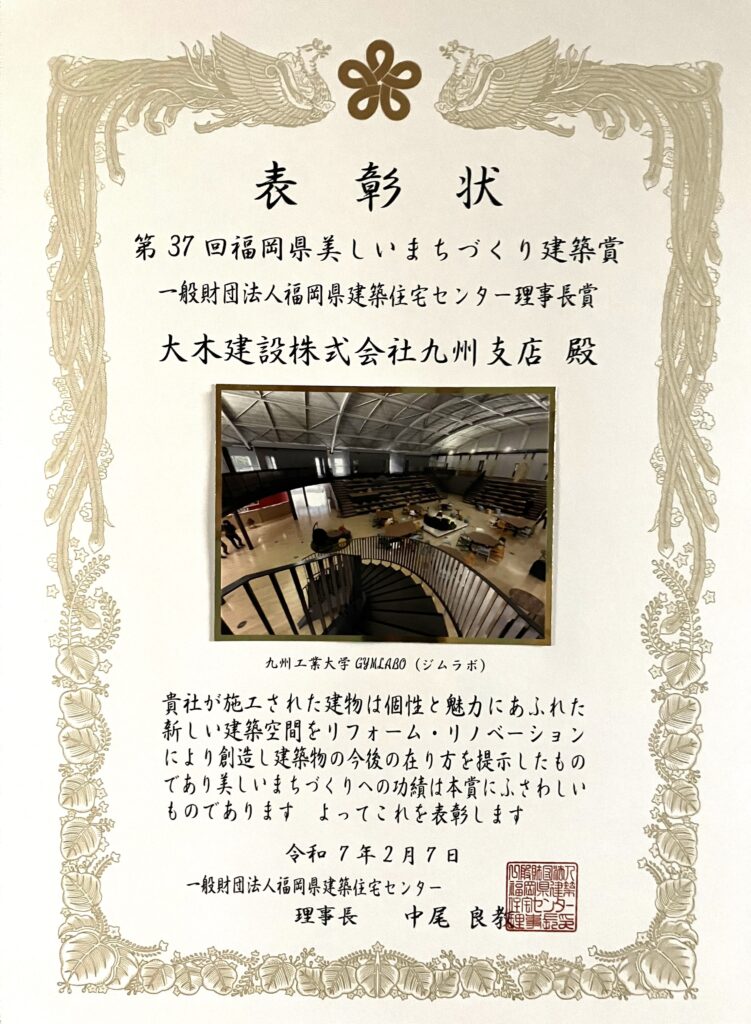 九州工業大学DX教育棟新営工事において第37回福岡県美しいまちづくり建築賞と第10回北九州市都市景観賞の表彰をいただきました。